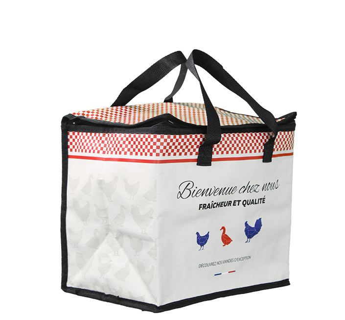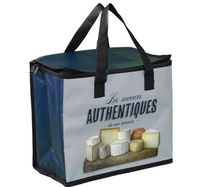 Sac spécial Fromagerie, 100% polypropylène non-tissé pelliculé 140 g/m², 2 anses courtes en polypropylène tressé. Dim : 360 + 300 x 270 mm. Recto avec visuel déjà imprimé, verso à personnaliser avec votre logo (280 x 180 mm max)