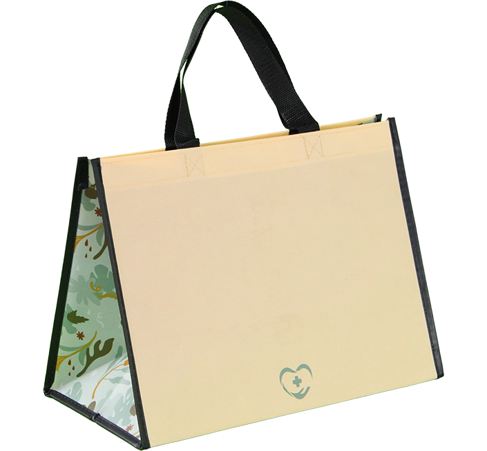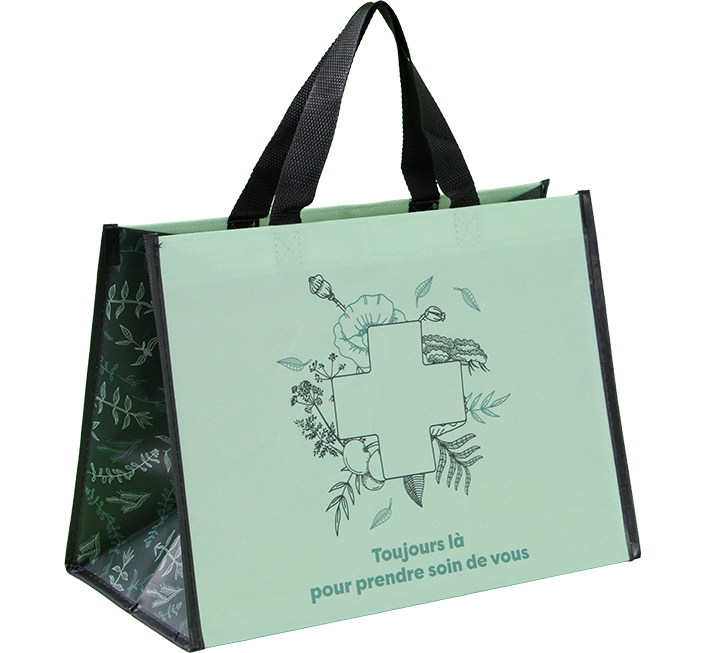 Sac spécial Pharmacie, 100% polypropylène non-tissé pelliculé 140 g/m², 2 anses courtes en polypropylène tressé. Dim : 360 + 200 x 270 mm. Recto avec visuel déjà imprimé, verso à personnaliser avec votre logo (280 x 150 mm max)