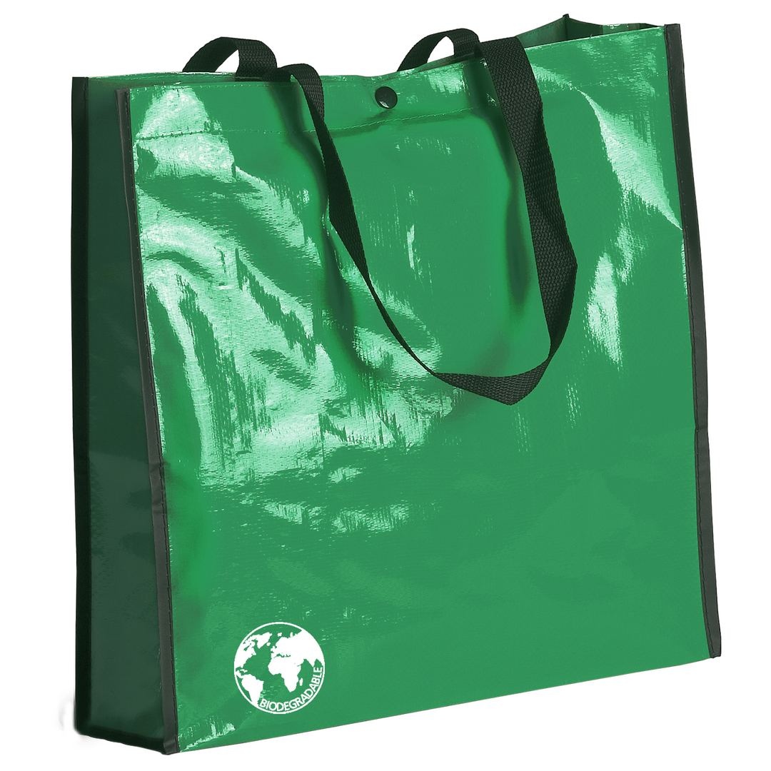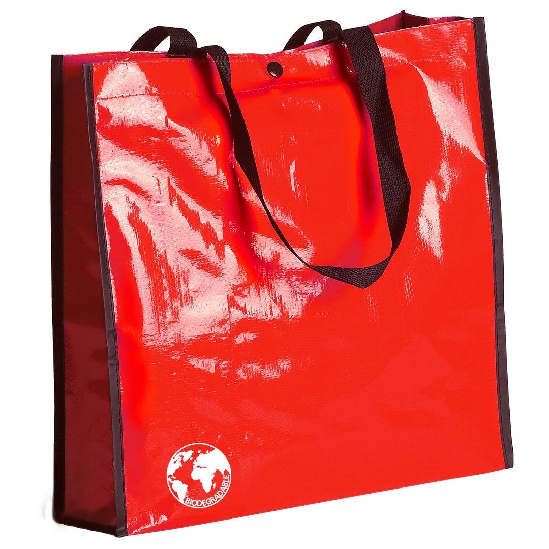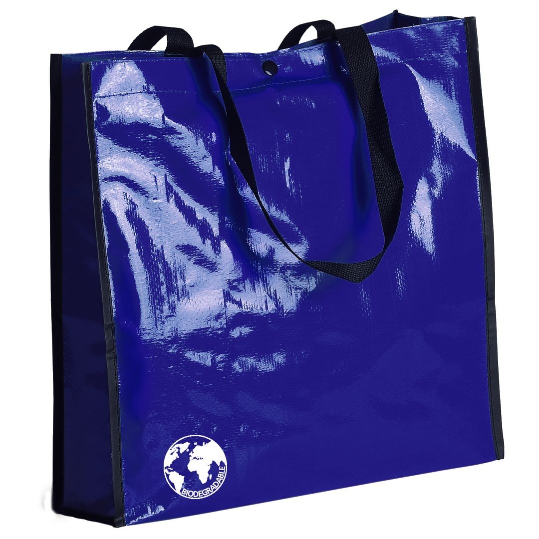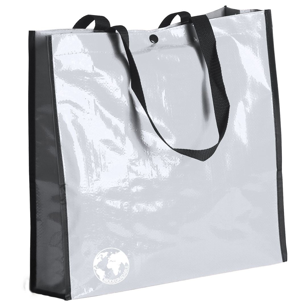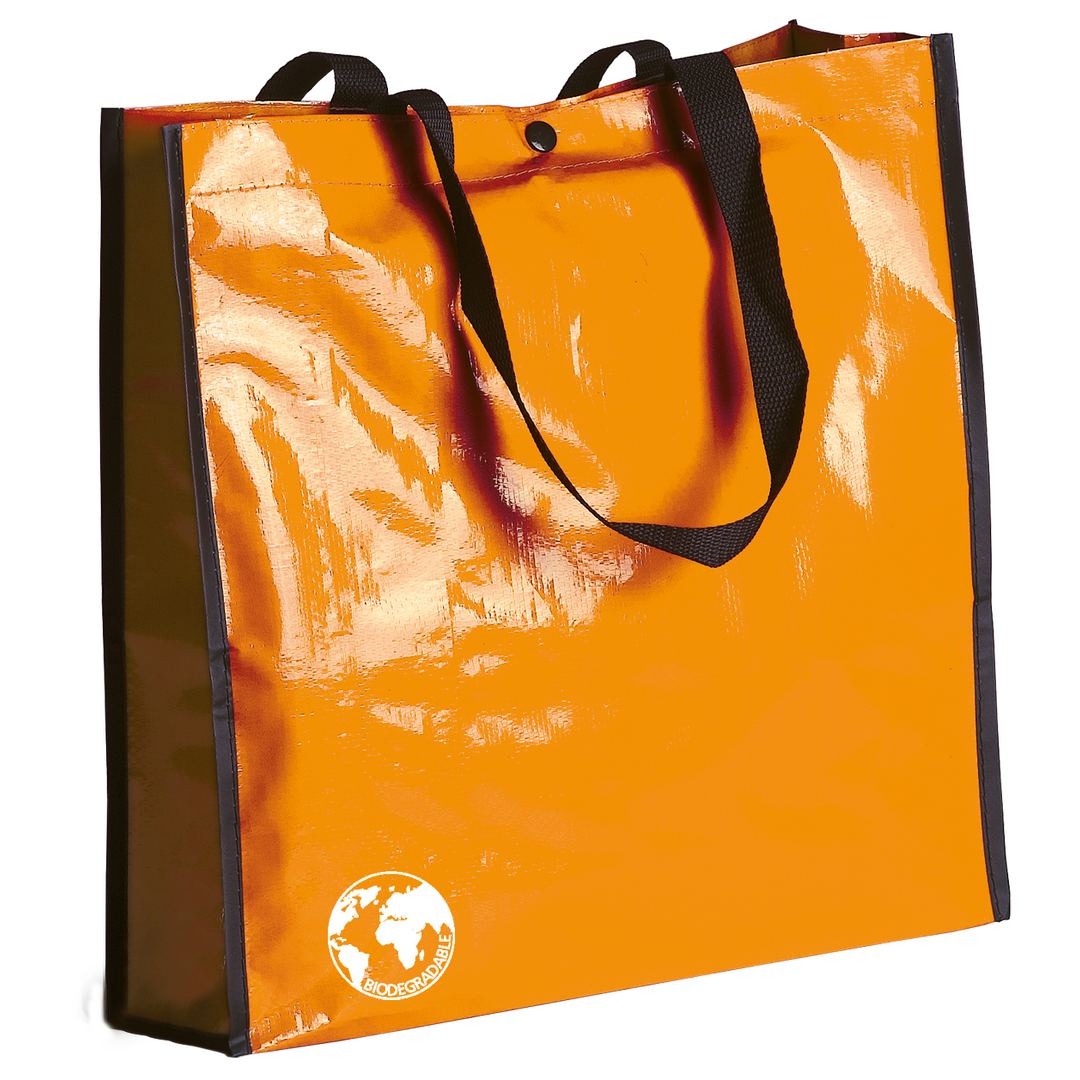 Sac biodégradable en laminé résistant proposé dans un grand choix de couleurs vives. Anses renforcées en nylon, longues de 70 cm, soufflet renforcé avec passepoil et fermeture par bouton pression. Finition cousue. Résistance au poids jusqu´à 12 kg.
