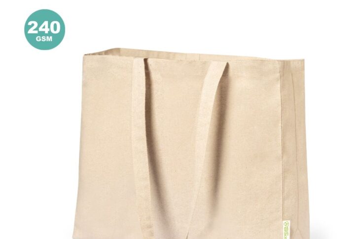Sac en matière coton recyclé de 140 g/m2 en combinaison avec le jute. Poignées longues de 60cm avec renfort, finition cousue et soufflet en jute. Logo en étiquette latérale et résistance jusqu’à 8 kg. Disponible dans une gamme variée de couleurs nature avec base de couleur naturelle.