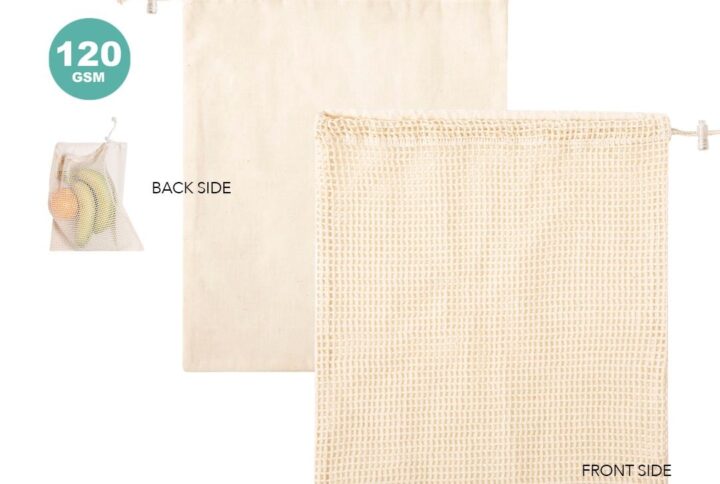 Le sac filet ou filet à provision éco-frienldy en coton écru de 220g / m2, avec une surface sans filet pour l’impression. Anses conformtables renforcées de 60 cm de long.
