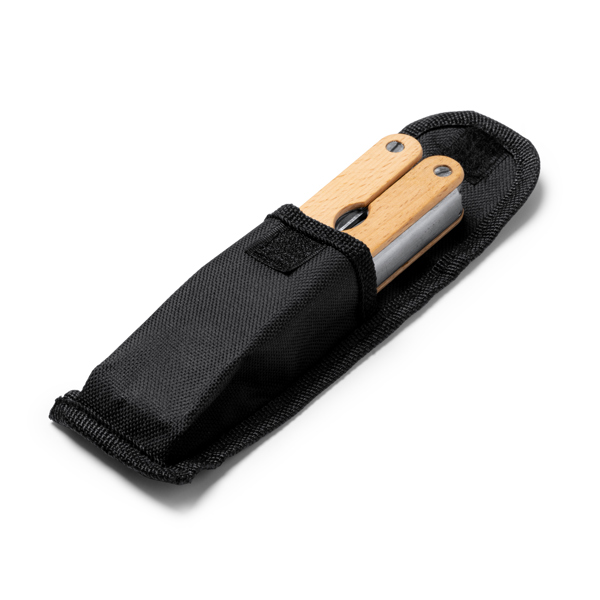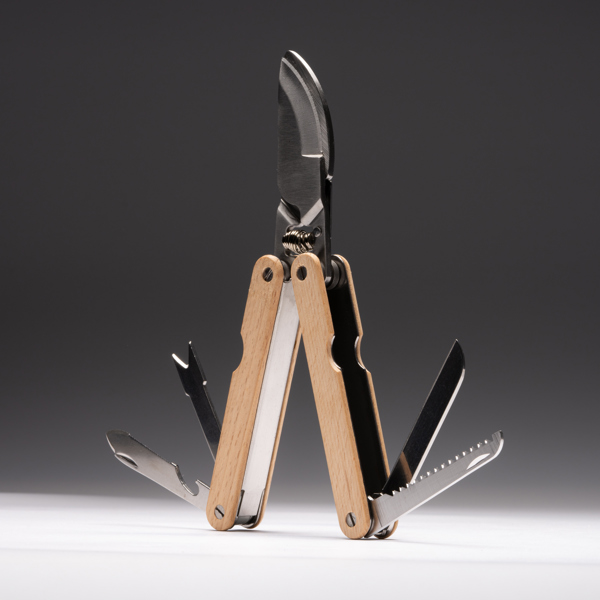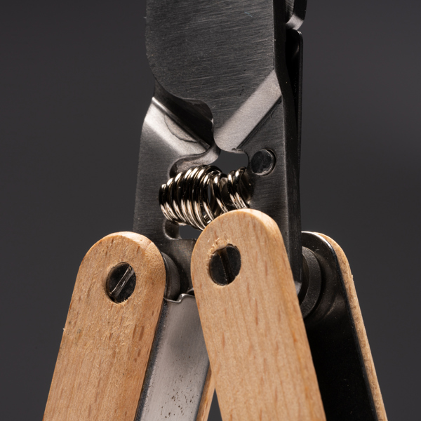 Sécateur multifonctions en acier inoxydable et poignée en bambou. Comprend 6 fonctions : sécateur, rasoir, scie, lime, tournevis et décapsuleur. Livré dans une pochette en toile puis dans une boite individuelle