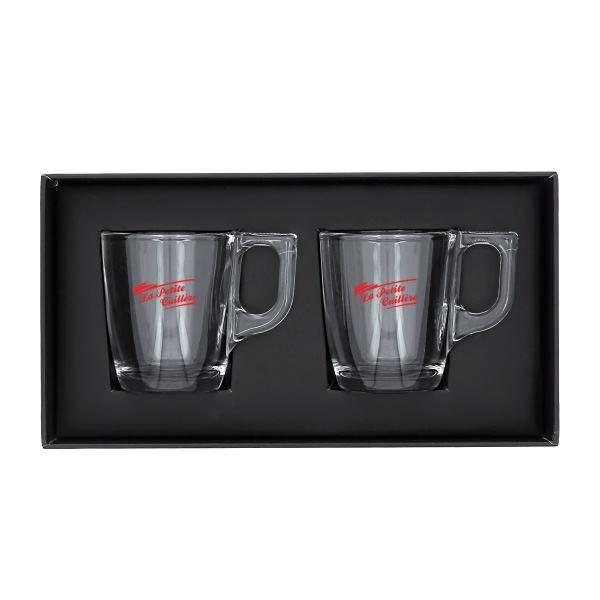 Coffret de deux tasses en verre trempé transparent (voir ref.CU419). Le verre trempé permet un empilement sûr sans risque de casse, assurant une gestion facile même dans un environnements professionnels exigeants.