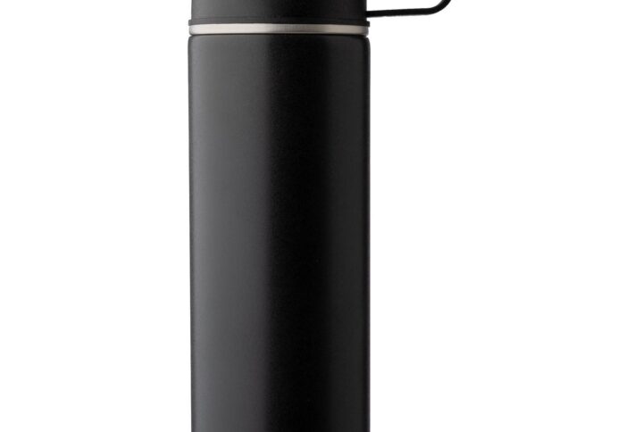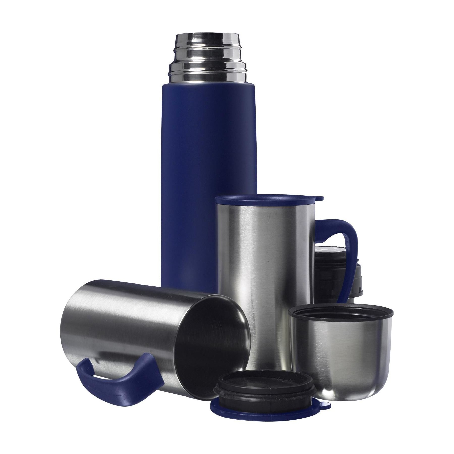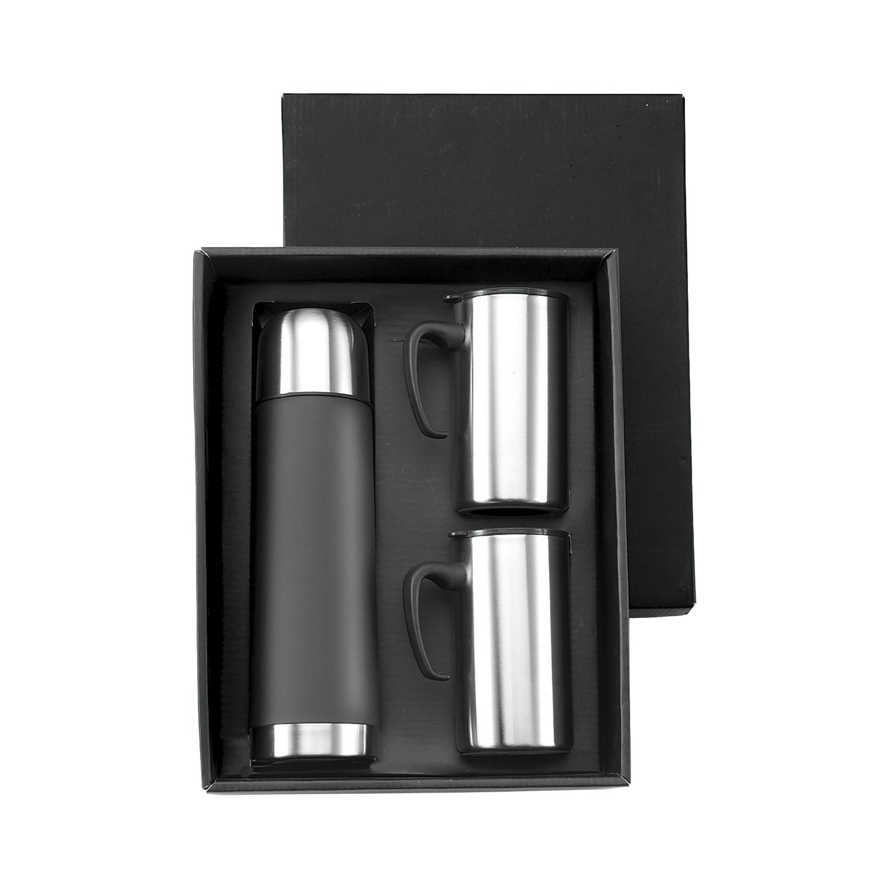 Boîte cadeau contenant une bouteille double paroi en acier inoxydable d’une contenance de 500 ml et 2 mugs de 300 ml en acier inoxydable.