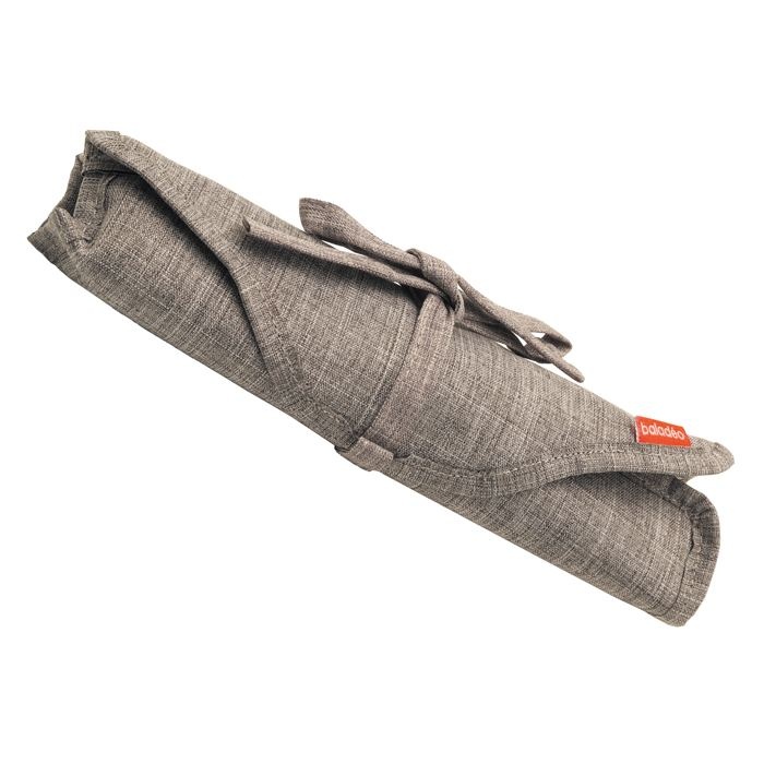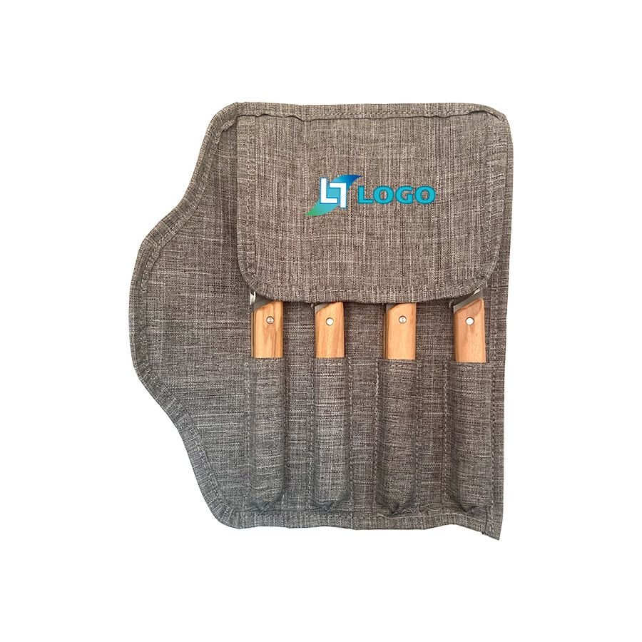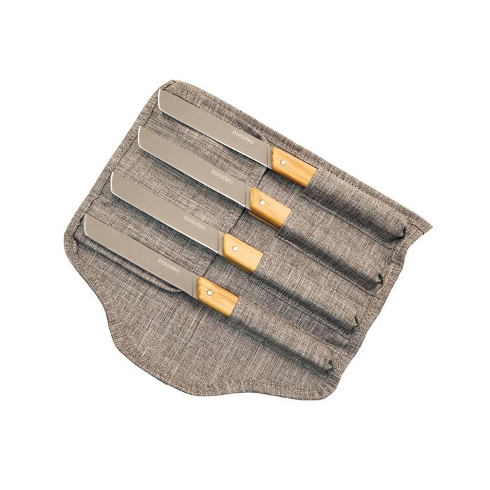 Lames de 10cm en acier inoxydable 420 à usage alimentaire (acier martensitique conforme à la norme EN10088-2 2005) avec finition titane. Manches en bois d’olivier nervuré. Livrés dans un roll up de rangement gris chiné en RPET.