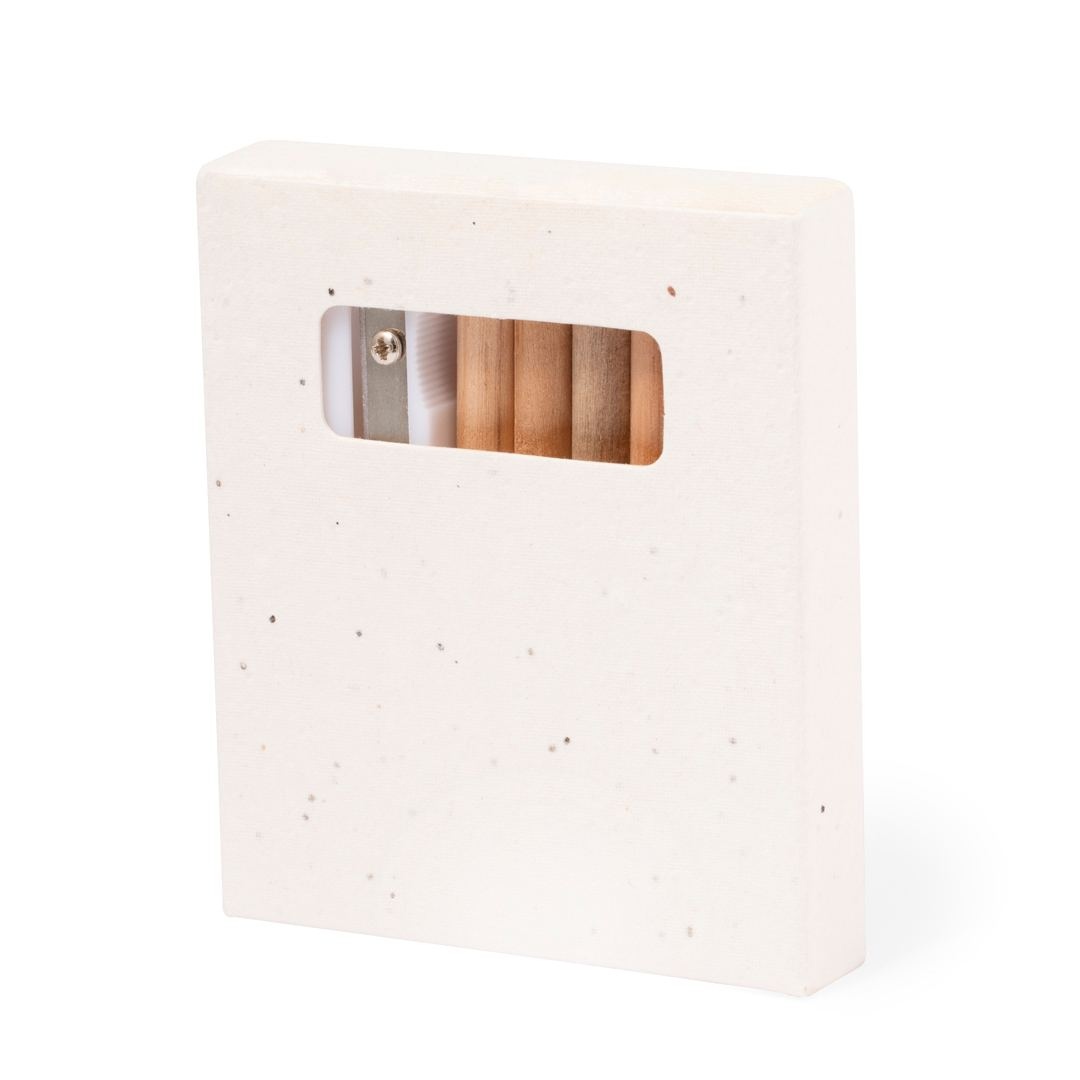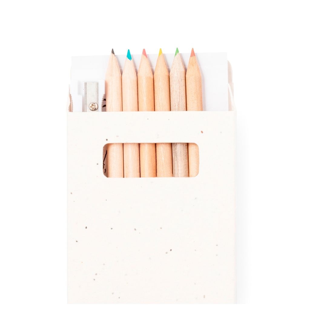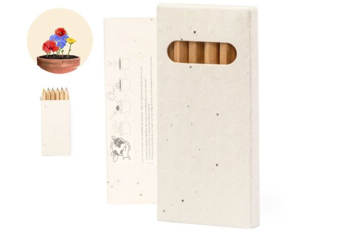 Set de 6 crayons avec pochoirs à colorier et taille-crayons, présenté dans une boîte en carton naturel avec des graines. Crayons en bois avec corps rond de finition naturelle et mines dans une gamme variée de couleurs. Il comprend des graines de pétunia dans la boîte, le transformant ainsi en carton plantable à la fin de sa durée de vie. Fleurs dans des couleurs assorties, avec des instructions de plantation sur le couvercle arrière.