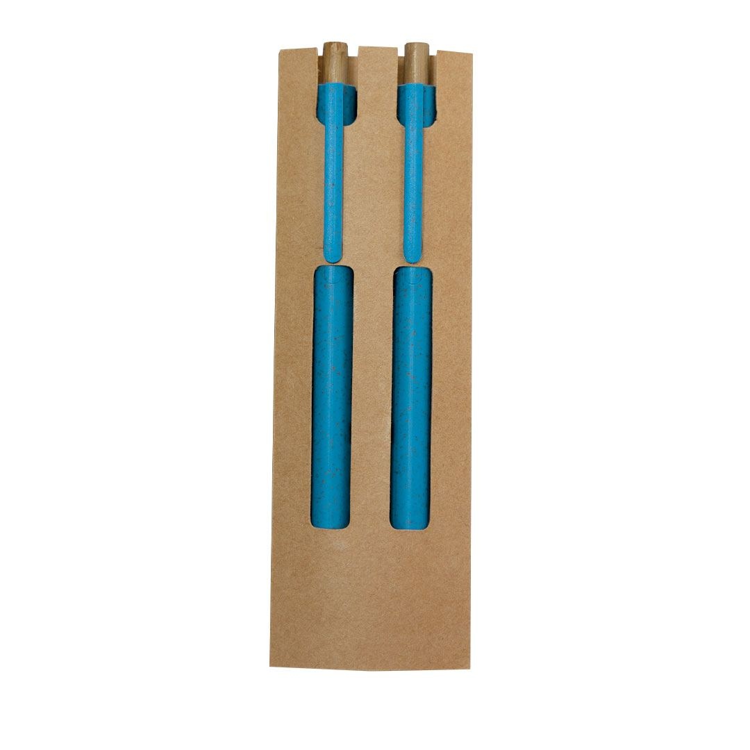 Set de stylo et crayon éternel fabriqués en paille de blé et bambou. Stylo avec mécanisme à bouton fabriqué en bambou avec encre bleue et clip assorti. Et crayon avec mécanisme à bouton fabriqué en bambou avec pointe éternelle, afin d’utiliser toujours le même crayon et de ne pas générer de déchets. Présentés dans un étui en carton recyclé. Avec marque de paille de blé imprimée.Fabriqué avec des éléments végétaux pour encourager l’utilisation de matières premières naturelles et réduire les émissions polluantes.