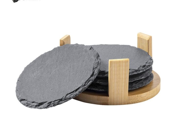 Ensemble de sous-verres en pin naturel. Comprend 4 pièces d’environ 1 cm d’épaisseur. Coupe naturelle, avec des diamètres de sous-verre entre 8 et 10 cm, avec une corde en jute naturelle.