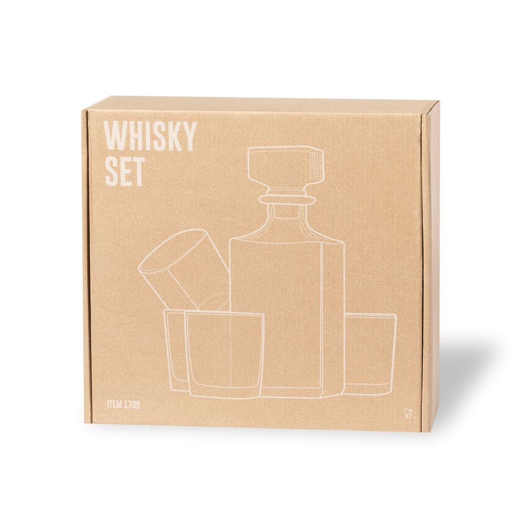 Service à whisky au design sobre et en verre. Comprend 4 verres de 200 ml et une carafe de 1 l, avec bouchon en verre. Présentation en boîte individuelle de conception kraft.