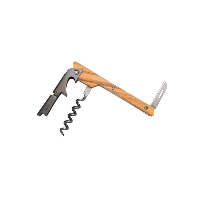 Tire-bouchon professionnel double levier. Manche en bois d’olivier nervuré. Mèche 5 spirales en acier inoxydable. Lame coupe collerette. Décapsuleur. Finition en titane gris anthracite sur le levier et la lame. Livré dans un étui gris chiné en RPET.