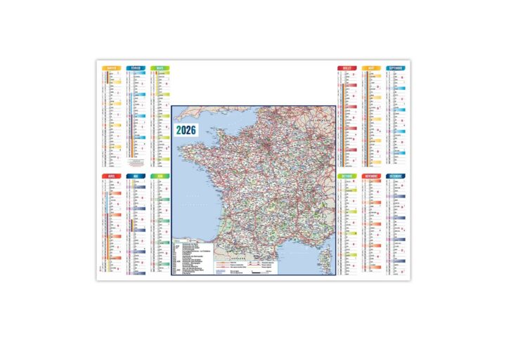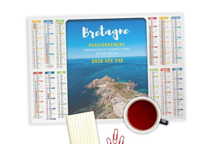 La grille calendaire est complète avec notamment les Saints. Crédit Photographique Carte de France et ses régions. Repiquage La personnalisation est prévue dans la zone de repiquage qui se trouve dans la partie blanche. Impression recto seul. Fichier à fournir par vos soins au format du repiquage en PDF sans fond perdu. Formats 2 formats au choix : – SMP 42 : 420 x 300 mm, – SMP 60 : 600 x 420 mm. Qualité SMP encapsulé et plastifié support plastique 300 microns. Quantité à partir de 25 exemplaires. Délai 2 semaines après accord du BAT. Réalisation du BAT (bon à tirer, maquette) sous 24 à 48 heures. Stock Toujours disponible.
