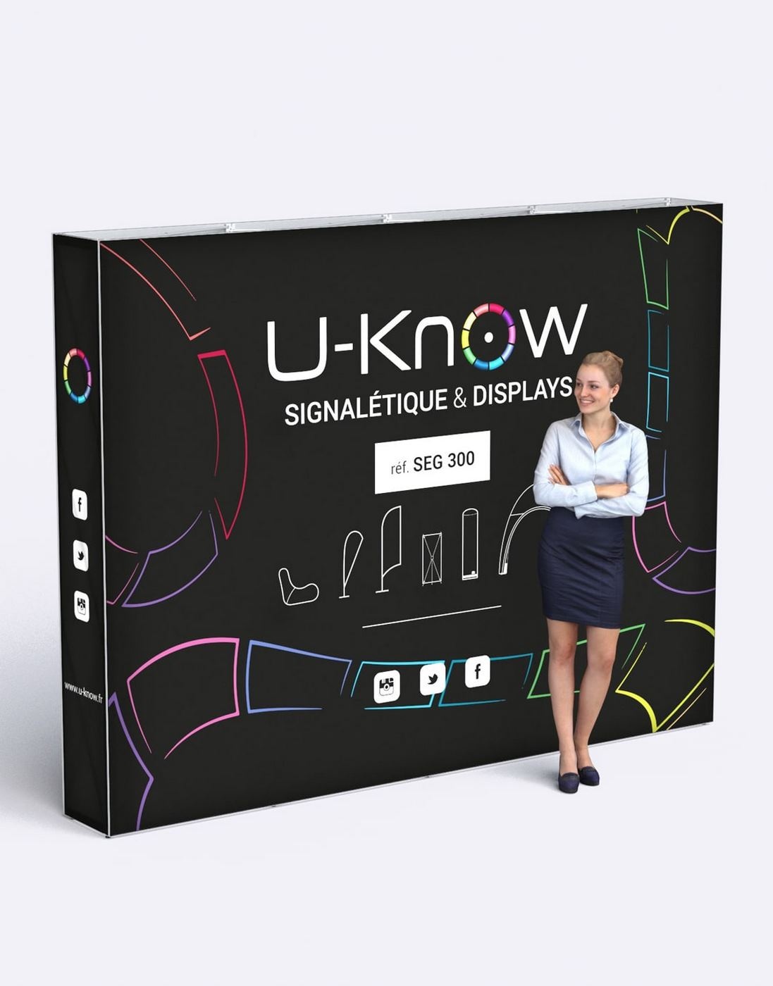 Le stand SEG 300 représente la solution d’affichage lumineux grand format la plus transportable du marché. L’installation est facile car elle emprunte la technique connue du popup ou parapluie. La finition est meilleure que les stands à fixation par Velcro grâce aux joints en silicone qui permettent une tension parfaite. En y ajoutant les accessoires nécessaires, la structure peut être habillée au verso également de sorte à présenter le support en milieu de stand et non seulement collée à un mur. Les LED qui permettent le rétro-éclairage sont en option et ne sont pas obligatoires sur la structure. En optant pour ces LED, il est fortement recommandé de réaliser un graphique avec un fond foncé et laisser le tracé du logo en réserve. L’impression est réalisée sur une matière polyester diffusante 290g/m². La structure est livrée dans un sac de transport inclus avec. Utilisation intérieure exclusivement. Possibilité de raccorder deux stands SEG en ligne droite ou en angle droit.Structure disponible sur stock, impression réalisée au moment de la validation de la commande.