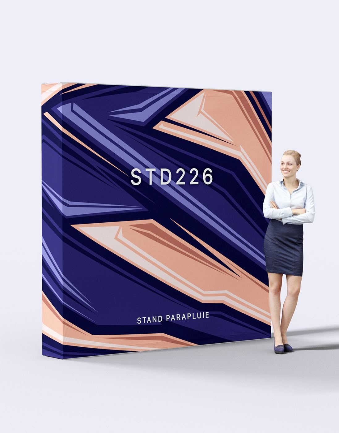 Stand parapluie droit avec retours aussi appelé photocall. La structure en aluminium se déploie en 2 secondes. Toile polyester fixée par des bandes velcro sur toute sa bordure. L’impression est réalisée en sublimation numérique haute définition. Sur le visuel ci-dessus, la partie droite a été retirée pour apercevoir la structure. L’ensemble est livré entièrement assemblé dans un sac de transport inclus. Trolley de transport en option..Structure disponible sur stock dans notre entrepôt parisien, impression réalisée après validation de la commande
