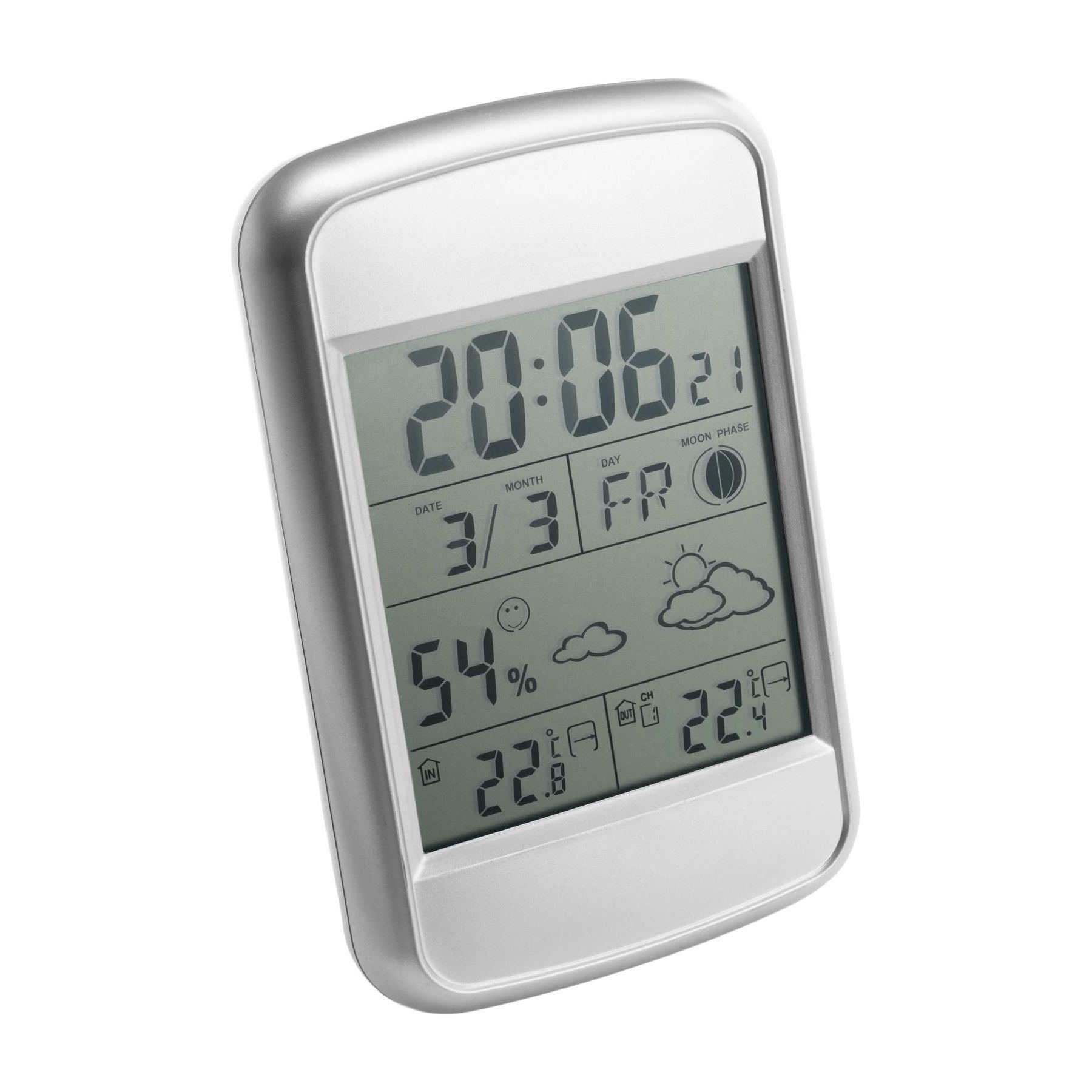 Station météo sans fil en plastique avec température intérieure/extérieure, prévisions météo, phase lunaire, hygromètre, calendrier, pendulette et alarme, piles incluses.