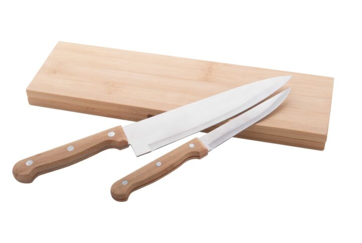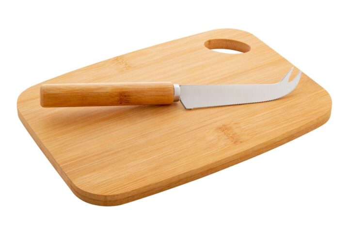 Set pour découper la viande avec planche à découper en bambou, fourchette et couteau en acier inoxydable avec poignées en bambou.