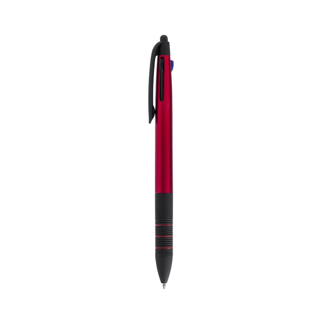 Stylo stylet 3 en 1 avec mécanisme à bouton poussoir rétractable. Ligne actuelle avec corps finition métallisé dans des couleurs vives. Attributs noirs et grip ergonomique noir avec anneaux assortis. 3 cartouches d´encre : bleue, rouge et noire.
