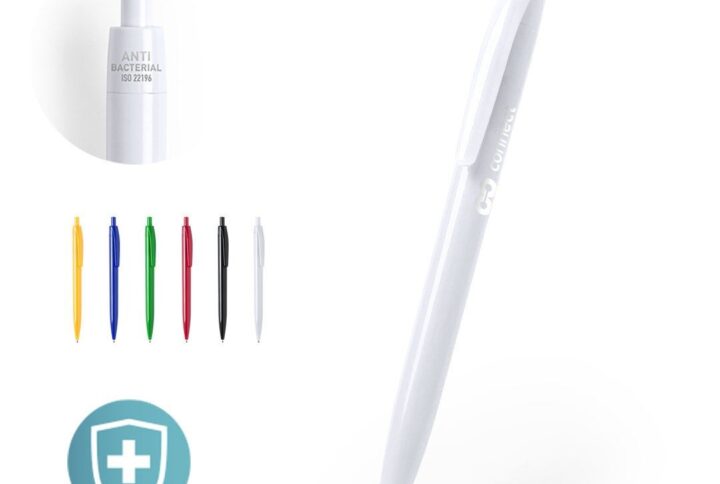 Stylo à bille antibactérien. Fabriqué en ABS, spécialement traité pour inhiber et empêcher la croissance bactérienne sur le corps du stylo grâce à la technologie nano-argent, un traitement spécial à base d’ions argent. Mécanisme à bouton-poussoir, détails de couleur argent et corps blanc. Clip découpé et prise confortable. Encre bleue. Norme ISO 22196: 2011, sur le mesurage de l’action antibactérienne sur les surfaces en plastique et autres surfaces non poreuses.