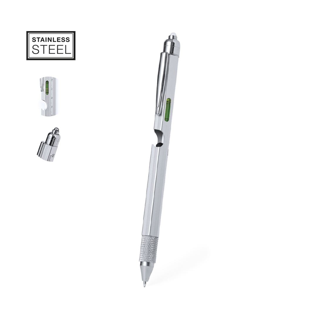 Stylo à bille multifonction 8 en 1 à mécanisme rotatif, en acier inox. Comprend règle en cm et pouces, niveau, ouvre-porte, 1 LED alimenté par pile bouton (incluse), pointeur, pointe plate et cruciforme. Avec clip métallique et encre bleue. Présenté individuellement dans une boîte de conception kraft.