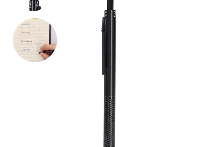 Stylo 4 en 1, mécanisme à poussoir rétractable, design classique et corps translucide proposé en couleurs vives. Avec attributs coloris argent et grip ergonomique doux de couleur noire. 4 cartouches : encre bleue, rouge, noire et verte.