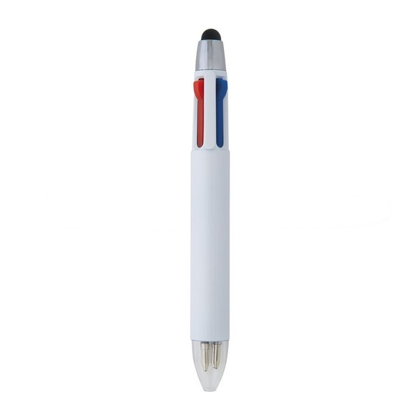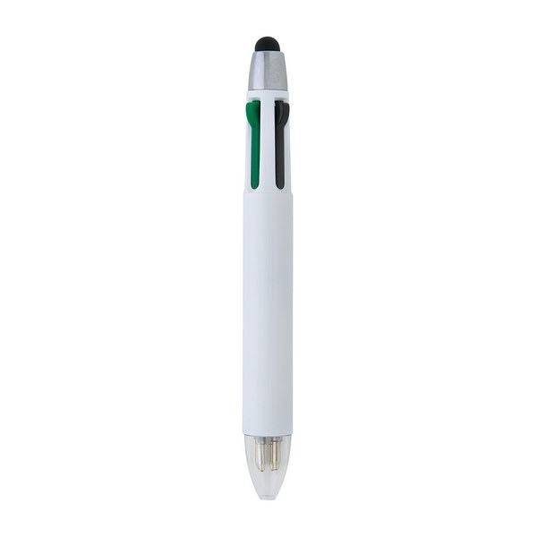 Stylo bille poussoir, 4 couleurs : encre noire, bleue, rouge et verte (couleurs d’écriture standards). Fonction stylet.