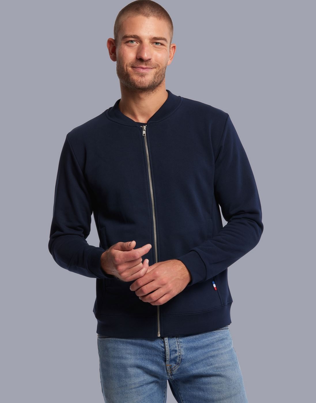 Blouson Made in France façon Teddy. 80% coton biologique certifié OCS, 20% polyester recyclé. 2 poches mains passepoilées. Matière Terry 350g/m² lavée, non grattée pour éviter le boulochage + traitement silicone pour améliorer la longévité du vêtement. Col en demi lune. Double piqure en bas de veste. Bande de propreté au col. Zip central YKK.