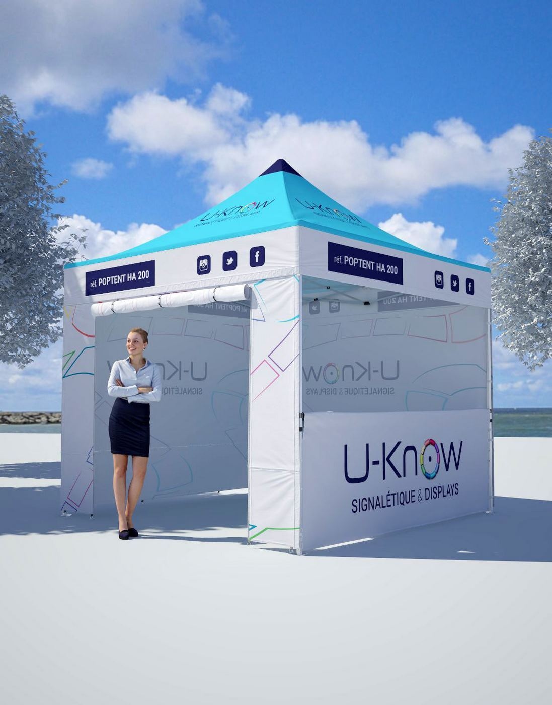Tente popup 2x2m dépliante en aluminium. Cette tente est particulièrement robuste. Sa structure est composée d’une armature hexagonale grise en aluminium de diamètre 40mm et d’épaisseur 1,2mm. Elle est personnalisée sur le toit et sur les portes en impression quadri numérique. Le toit et les portes sont en polyester Oxford 260g/m² avec enduction et sont montés par Velcro sur la tente. La tente est livrée prête à monter dans un trolley de transport en Oxford 600D à roulettes. Poids : 12kg