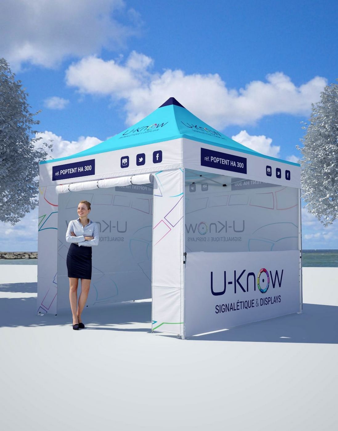 Tente popup 3x3m dépliante en aluminium. Ce barnum est particulièrement robuste. Sa structure est composée d’une armature hexagonale grise en aluminium de diamètre 40mm et d’épaisseur 1,2mm. Elle est personnalisée sur le toit et sur les portes en impression quadri numérique. Le toit et les portes de cette tonnelle sont en polyester Oxford 260g/m² avec enduction pour garantir l’impérméabilité et sont montés par Velcro sur la tente. La tente est livrée prête à monter dans un trolley de transport en Oxford 600D à roulettes. Poids : 14kg