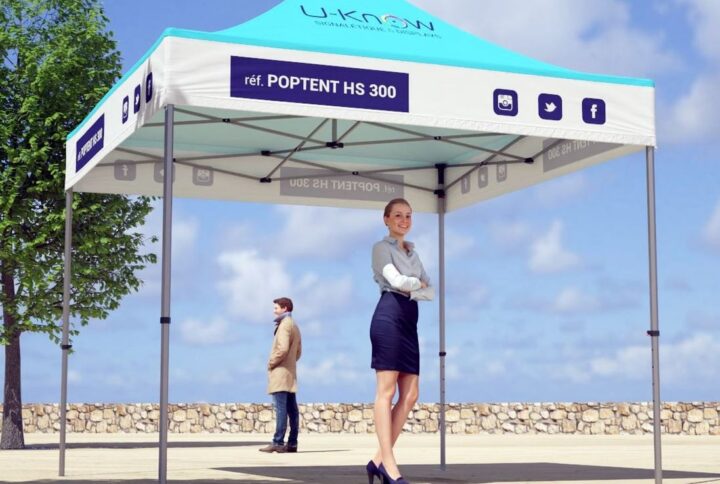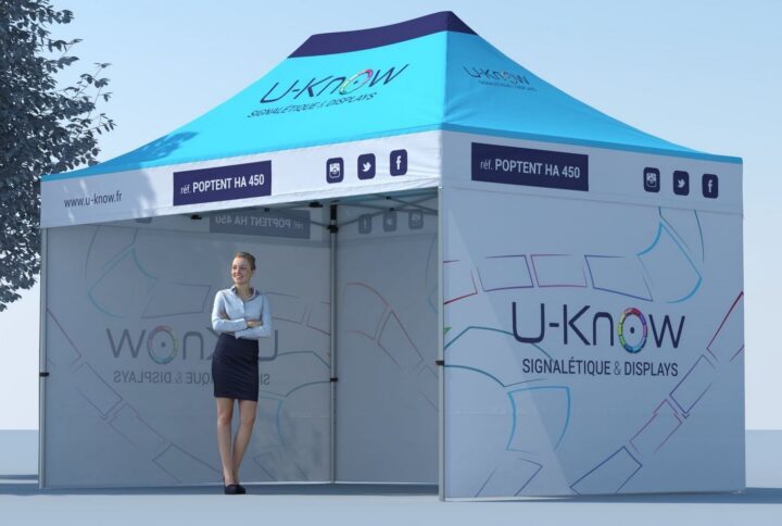 Tente popup 3x3m dépliante en aluminium. Ce barnum est particulièrement robuste. Sa structure est composée d’une armature hexagonale grise en aluminium de diamètre 40mm et d’épaisseur 1,2mm. Elle est personnalisée sur le toit et sur les portes en impression quadri numérique. Le toit et les portes de cette tonnelle sont en polyester Oxford 260g/m² avec enduction pour garantir l’impérméabilité et sont montés par Velcro sur la tente. La tente est livrée prête à monter dans un trolley de transport en Oxford 600D à roulettes. Poids : 14kg