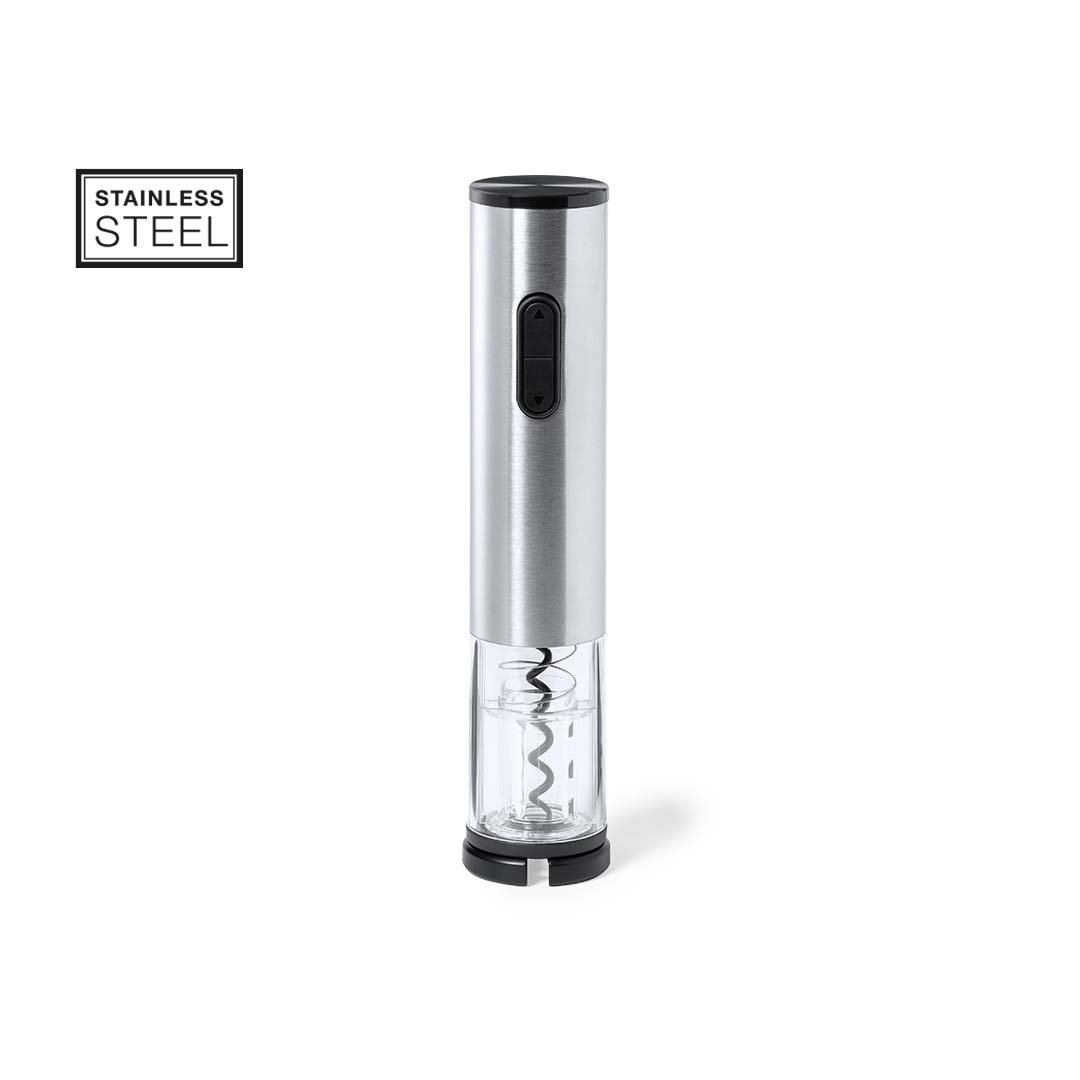 Tire-bouchon électrique en acier inoxydable et ABS résistant, avec coupe capsule inclus. Présenté dans une boîte individuelle design, avec un manuel d’instructions en espagnol et en anglais. Fonctionne sur piles (4xAA non incluses).