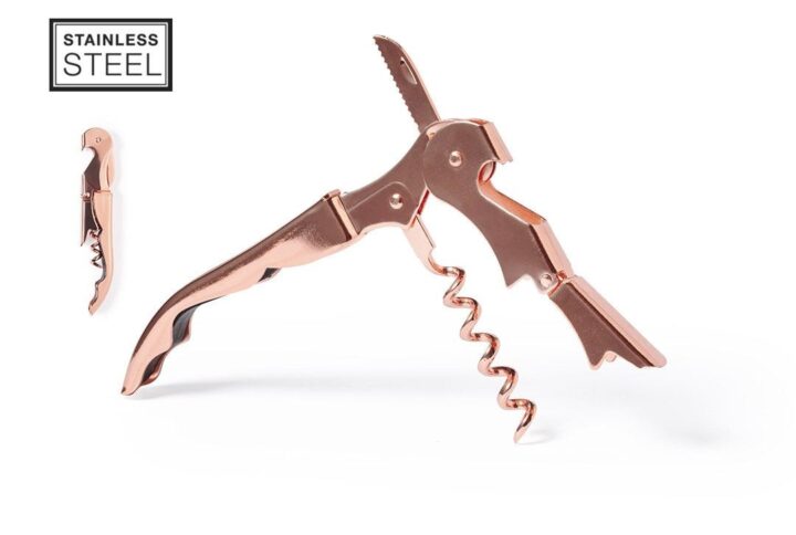 Tire-bouchon sommelier en acier inoxydable. Mécanisme à deux crans. Décapsuleur, coupe-capsule et tire-bouchon. Présentation sous boîte individuelle.