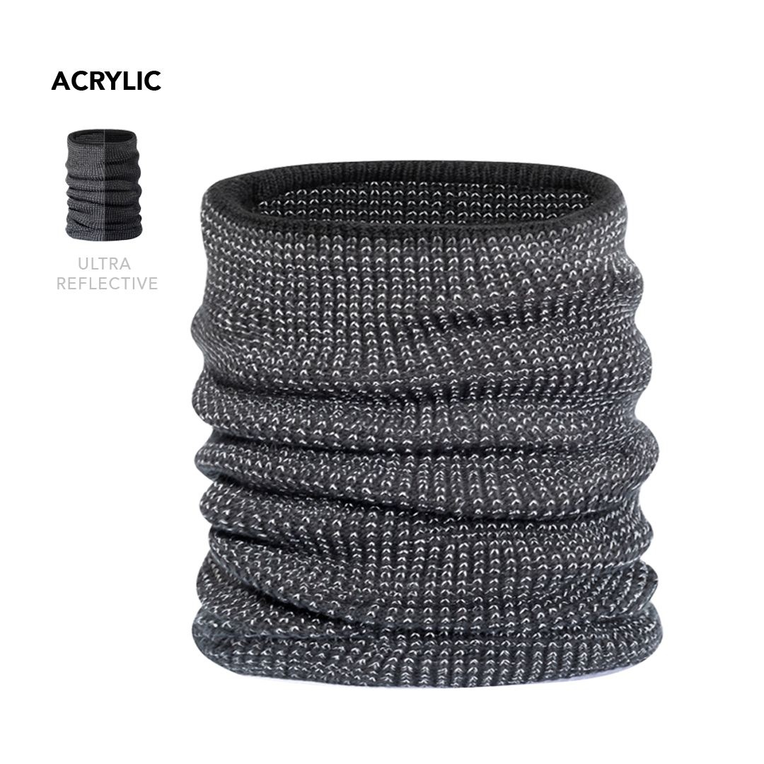 Tour de cou chaud réfléchissant en tricot côtelé, fabriqué en matériau souple acrylique élastique en combinaison avec polyester, et intérieur en polaire souple Fleece. Comprend un fil réfléchissant entrelacé à l’intérieur du tissu pour augmenter la visibilité.