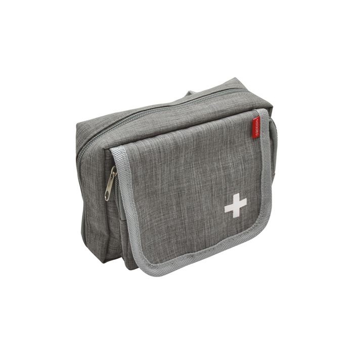 Trousse en tissu wulong gris chiné composée des éléments suivants : manuel de premiers secours, ciseaux, pince en plastique, gants en vinyle, sparadrap, 4 compresses alcoolisées, 17 pansements, 1 bande flexible 6cm x 4m, 1 bandage triangulaire, 4 compresses stériles 5 x 5cm, une couverture de survie 2 faces (une face argent, une face or), un marteau brise vitre coupe ceinture.