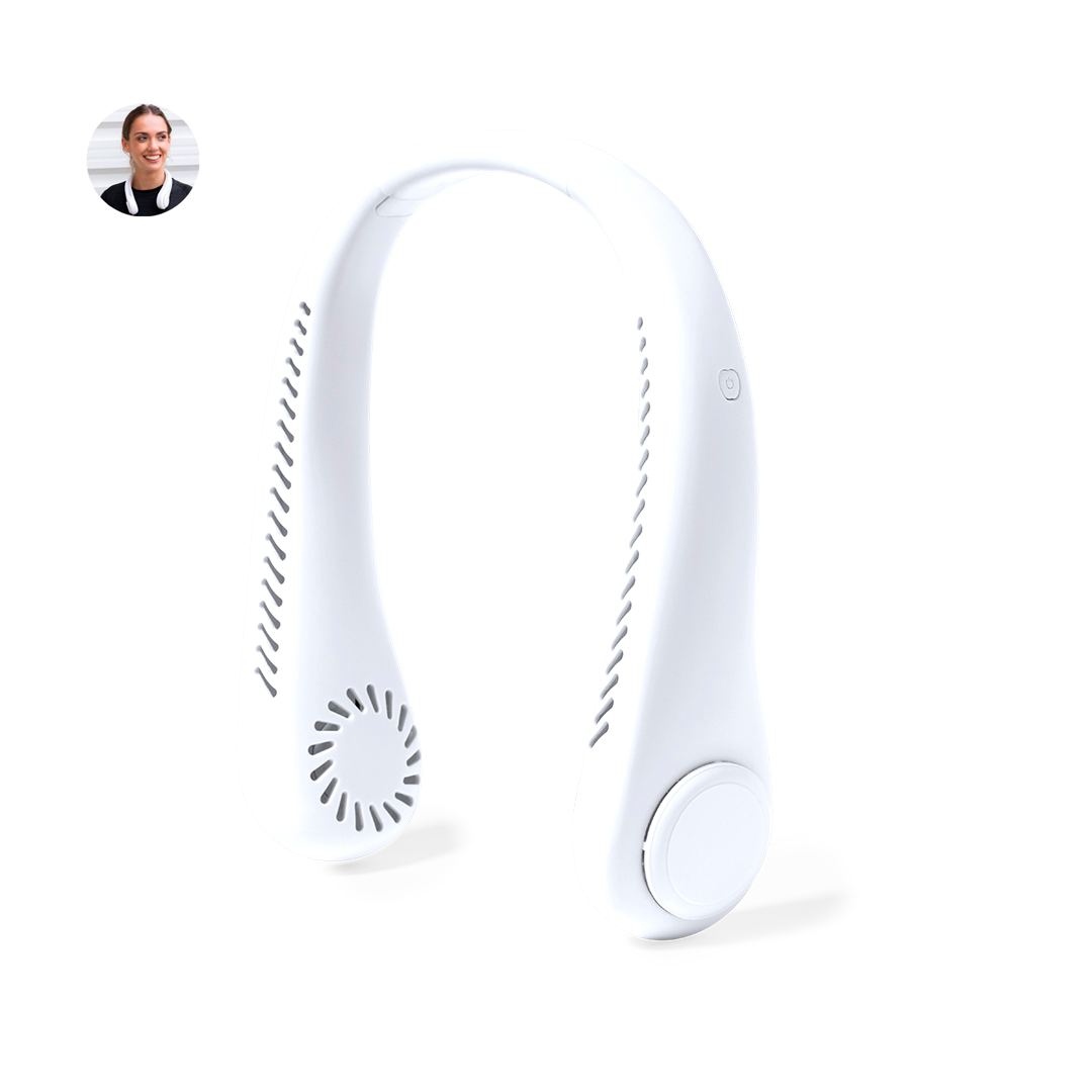 Ventilateur portable pratique en ABS robuste. Ce ventilateur élégant a un design en forme de collier pour le placer autour du cou, offrant une sensation rafraîchissante. Il offre trois positions de vitesse différentes et est rechargeable grâce à sa batterie de 800 mAh, câble micro USB inclus. Présenté dans une boîte de conception kraft.