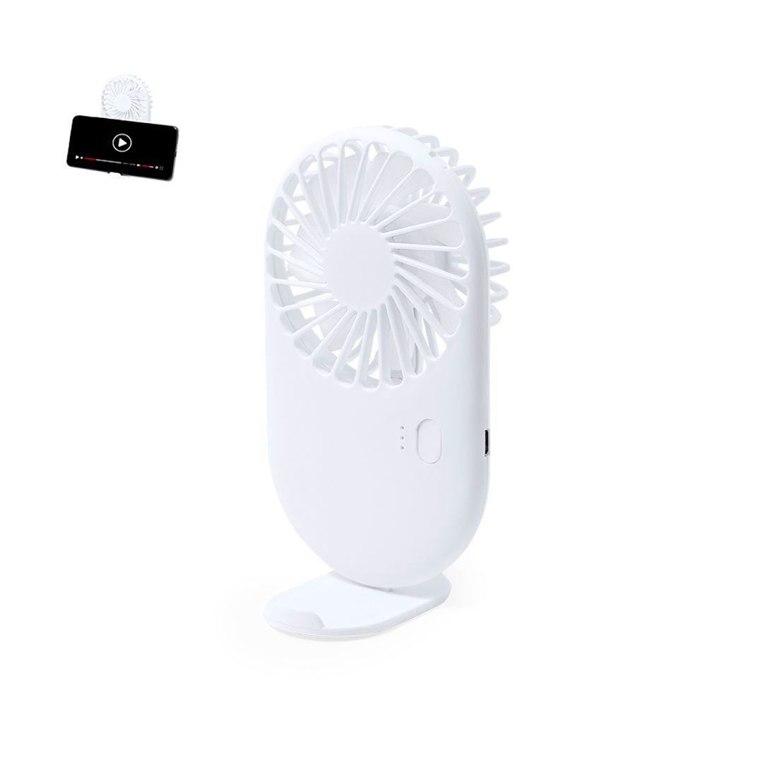 Ventilateur portable en ABS robuste. Il a trois vitesses et un support intégré pour smartphone. Il est alimenté par une batterie de 300 mAh, avec des indicateurs lumineux qui montrent le niveau de charge et le câble micro USB inclus. Présenté individuellement dans la boîte de conception kraft.