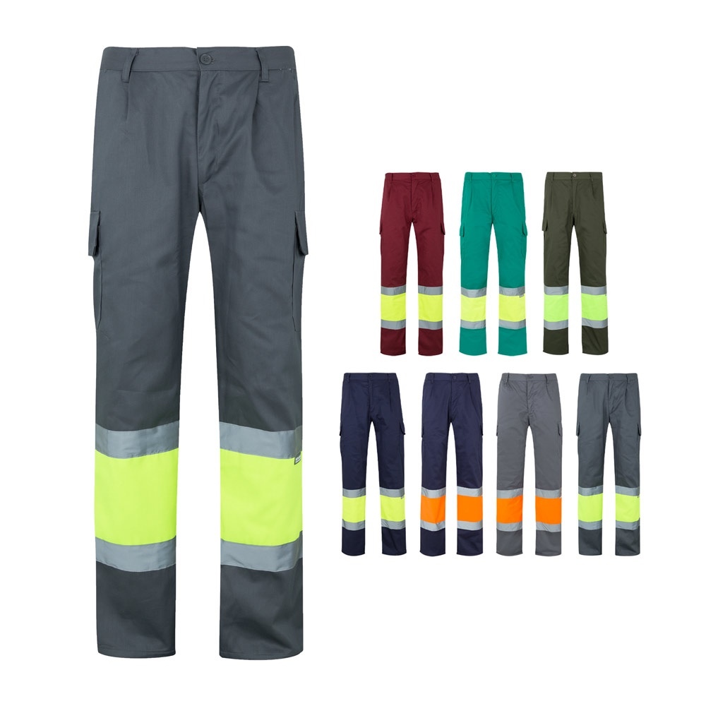 Pantalon en sergé bicolore (210g/m²), doublé, multipoches, en coton (20%) et polyester (80%). Taille élastique, bandes réfléchissantes sur le bas du pantalon. Contient six poches (2 poches françaises, 2 poches latérales à soufflet et 2 poches arrière). Produit conforme au règlement (UE) 2016/425, certifié par EN20471 et classe Nº 1. Taille: S, M, L, XL, 2XL, 3XL