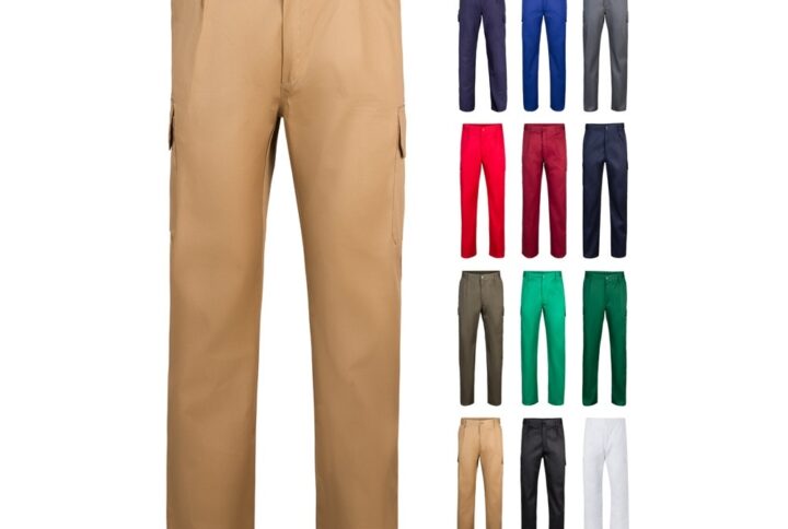 Pantalon bicolore multipoches en sergé (200g/m²), en coton (35%) et polyester (65%). Taille élastiquée et couleur contrastée sur les soufflets, les tirettes et les coutures. Contient six poches : (2 poches françaises, 2 poches à soufflet latérales et 2 poches à soufflet arrière). Taille: 34, 36, 38, 40, 42, 44, 46, 48, 50, 52, 54, 56, 58, 60